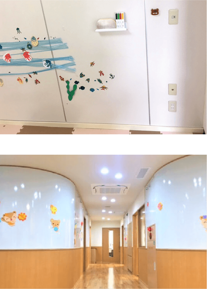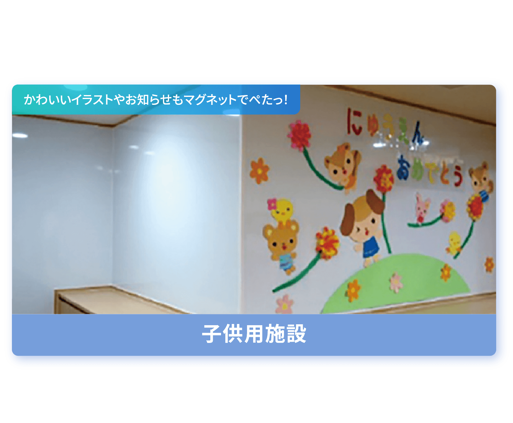 ガラスの美しさと金属の強さ、両方のメリットを持つホーローは、高い性能を求められる内装の素材として、マンションやオフィスビルのエントランス、病院や高齢者向け施設の内装、ホテル、商業施設、交通機関など、様々なシーンに活用いただけます。